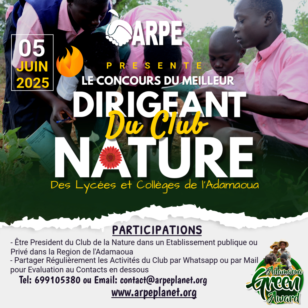 L'Organisation Action pour le Respect et la Protection de l'Environnement (ARPE) est fière d'annoncer le lancement du Concours du Meilleur Président de Club Nature des Lycées et Collèges de la Région de l'Adamaoua, au Cameroun. Ce concours vise à reconnaître et à valoriser les jeunes leaders engagés dans la préservation de l'environnement au...